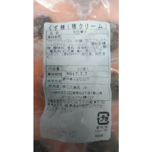 製品名:葛餅(柿クリーム) 単価: 590円/約400g(パック)(税別) 受注最小ロット: 16520円/1ケース(20個×28パック)(税別) 生(原)産地: 日本 荷姿: 1ケース(20個×28パック) 製品重量:1個約20g(目安値) 製品サイズ:約35mm×35mm×25mm 賞味期限: 約半年(冷凍) 解凍方法: 自然解凍 納期/発送体制: 受注日より3日以内/冷凍便 参考メニュー: デザート 原材料、食品添加物: 写真2を参照下さい。